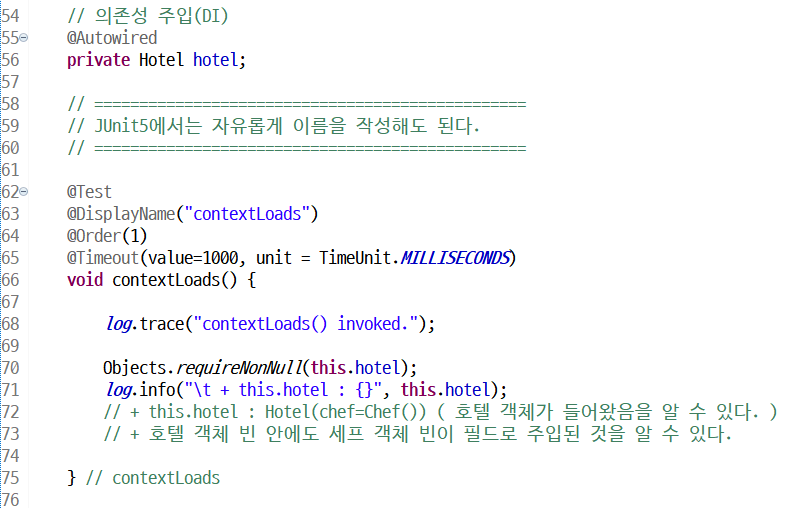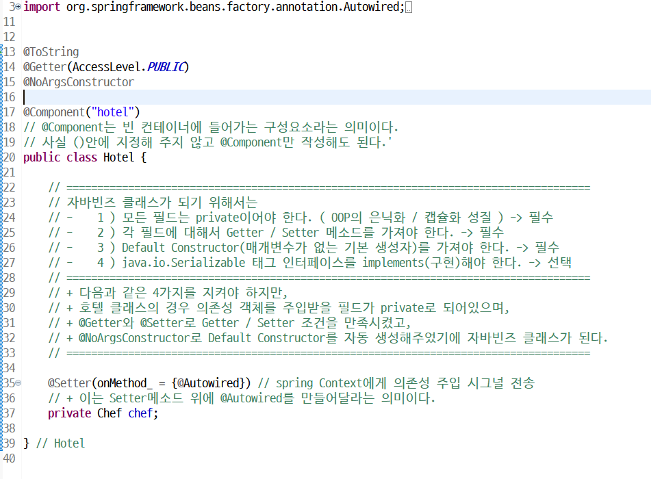 // + 호텔 객체 빈 안에도 세프 객체 빈이 필드로 주입된 것을 알 수 있다.