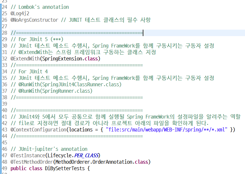 // JUnit 테스트 메소드 수행시, Spring FrameWork를 함께 구동시키는 구동자 설정