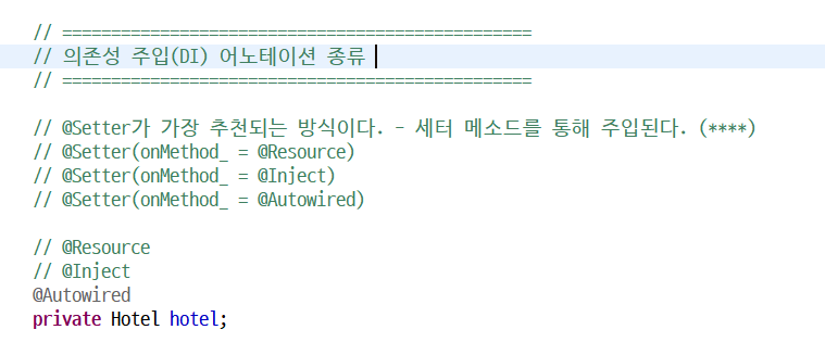 // + 호텔 클래스의 경우 의존성 객체를 주입받을 필드가 private로 되어있으며,