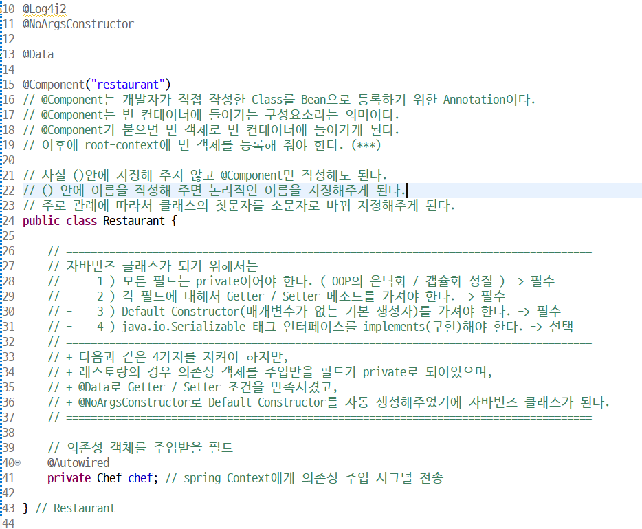 - 이 @Component 어노테이션이 불은 모든 자바빈즈 클래스를 한번에 스프링의 빈으로 설정하기 위해서는 root-context.xml 파일에서 <context:component-scan base-package="범위지정(ex.org.zerock.myapp)" /> 태그를 통해 설정할 수 있다.