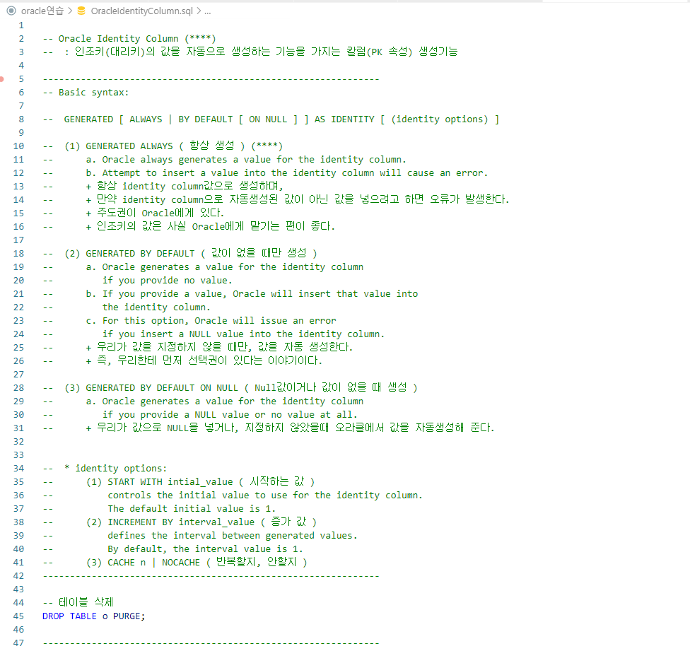 -- 인조키는 Oracle에게 맡기는 편이 좋기에 ALWAYS를 사용하는 것이 좋다. (***)