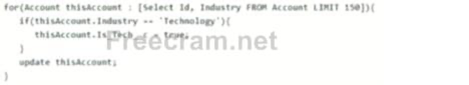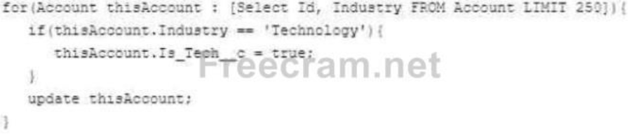 - D. AggregateResult[] groupedResults = [SELECT CampaignId, AVG(Amount) theAverage FROM Opportunity GROUP BY CampaignId]; for (AggregateResult ar : groupedResults) { System.debug(‘Campaign ID’ + ar.get(‘CampaignId’)); System.debug (‘Average amount’ + ar.theAverage); }