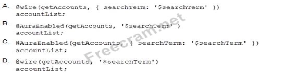 5. An Apex method, getAccounts, that returns a List of Accounts given a searchTerm, is available for Lightning Web components to use. What is the correct definition of a Lightning Web component property that uses the getAccounts method?