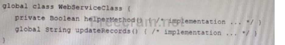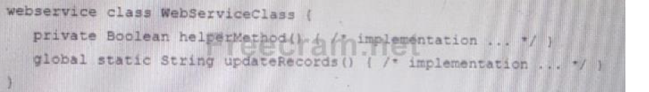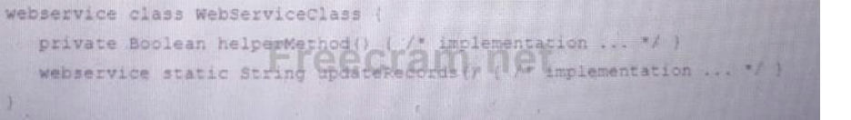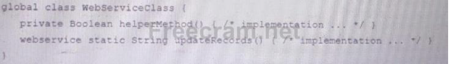 12. A developer needs to implement a custom SOAP Web Service that is used by an external Web Application. The developer chooses to Include helper methods that are not used by the Web Application In the Implementation of the Web Service Class. Which code segment shows the correct declaration of the class and methods? (check)