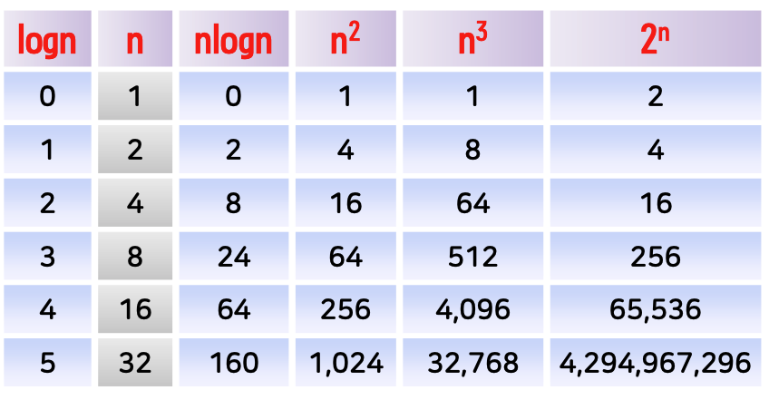 - O(1) : 상수 시간 < O(logn) : 로그 시간 < O(n) : 선형 시간 < O(nlogn) 로그 선형 시간< O(n2) : 제곱 시간 < O(n3) : 세제곱 시간 < O(2n) : 지수 시간