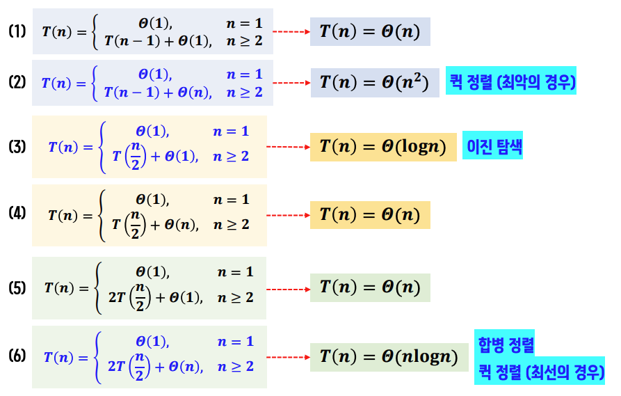 - 순환 알고리즘의 수행시간은 점화식 형태로 정의되며, 폐쇄형을 구해서 표현