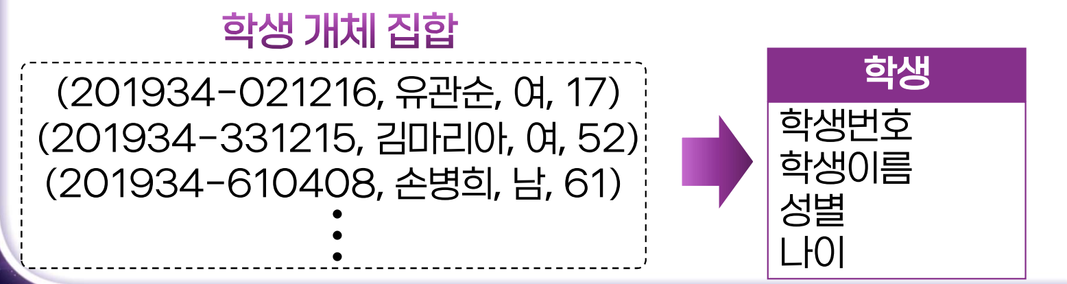 - 개체 집합, 관계 집합, 속성