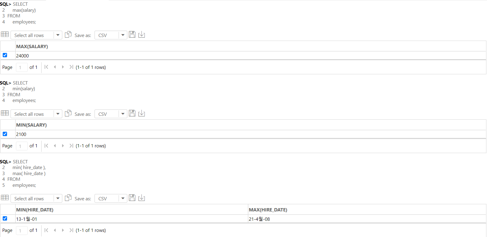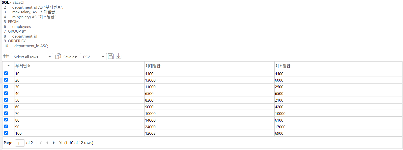-- 모든 사원을 부서별로 그룹화한 후에, 부서번호, 각 부서별 최대 / 최소 월급을 부서번호를 기준으로 오름차순 정렬하였다.