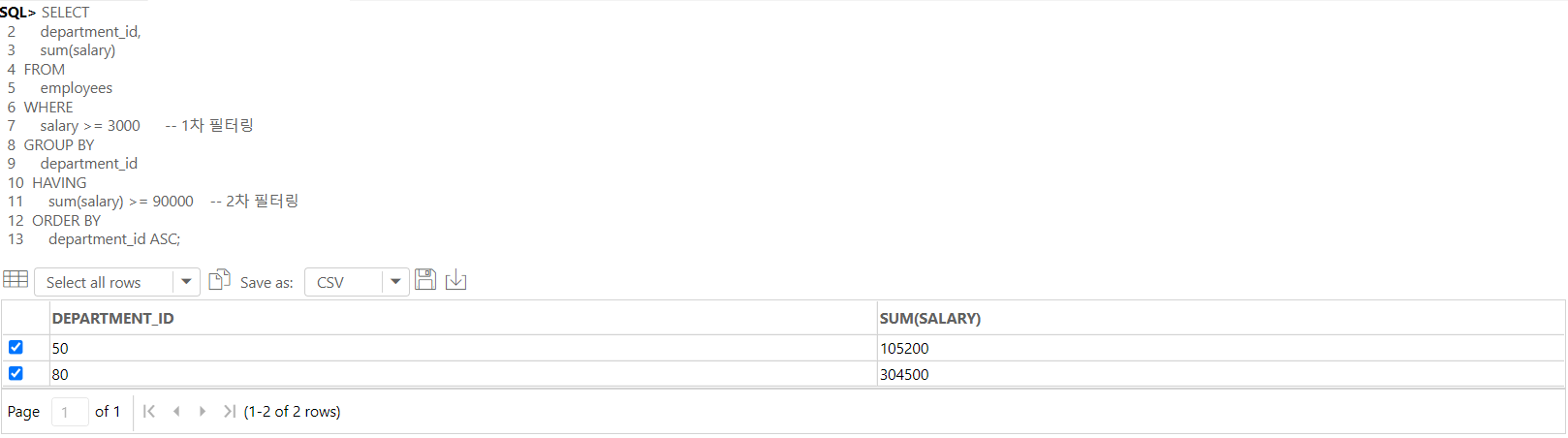 -- ( WHERE절: 1차 필터링, HAVING절: 2차 필터링 )