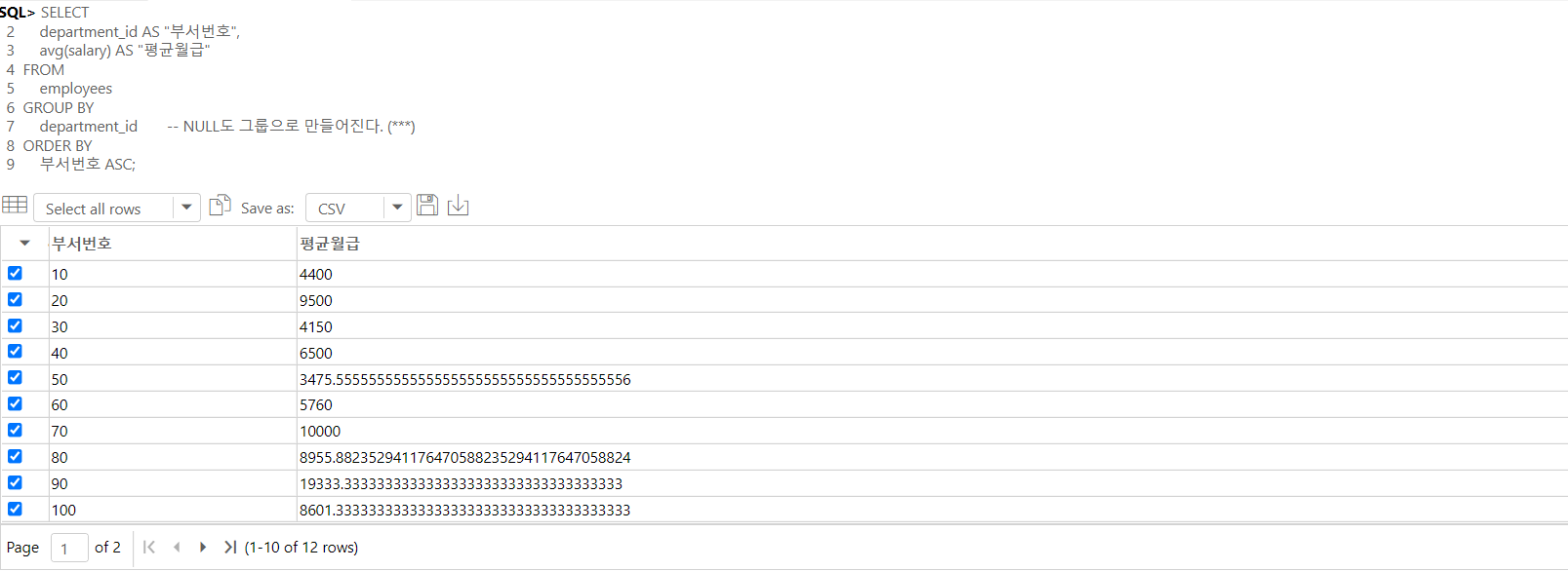 -- department_id는 NULL을 허용하는데, where절로 NULL을 필터링하지 않았기에 NULL도 따로 그룹으로 형성되어 만들어진다.