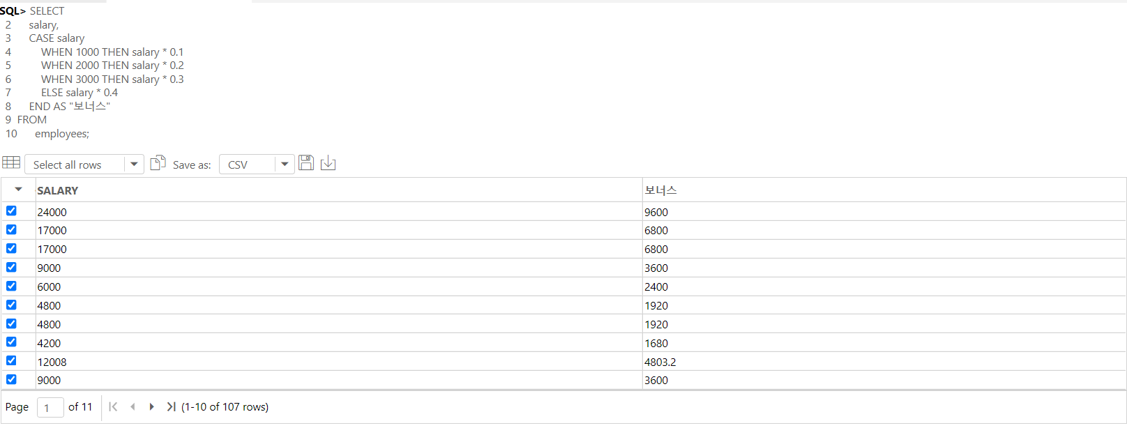 -- 월급이 1000, 2000, 3000, 그 외일때를 구분하여 조건문으로 보너스 계산식을 지정하였다.