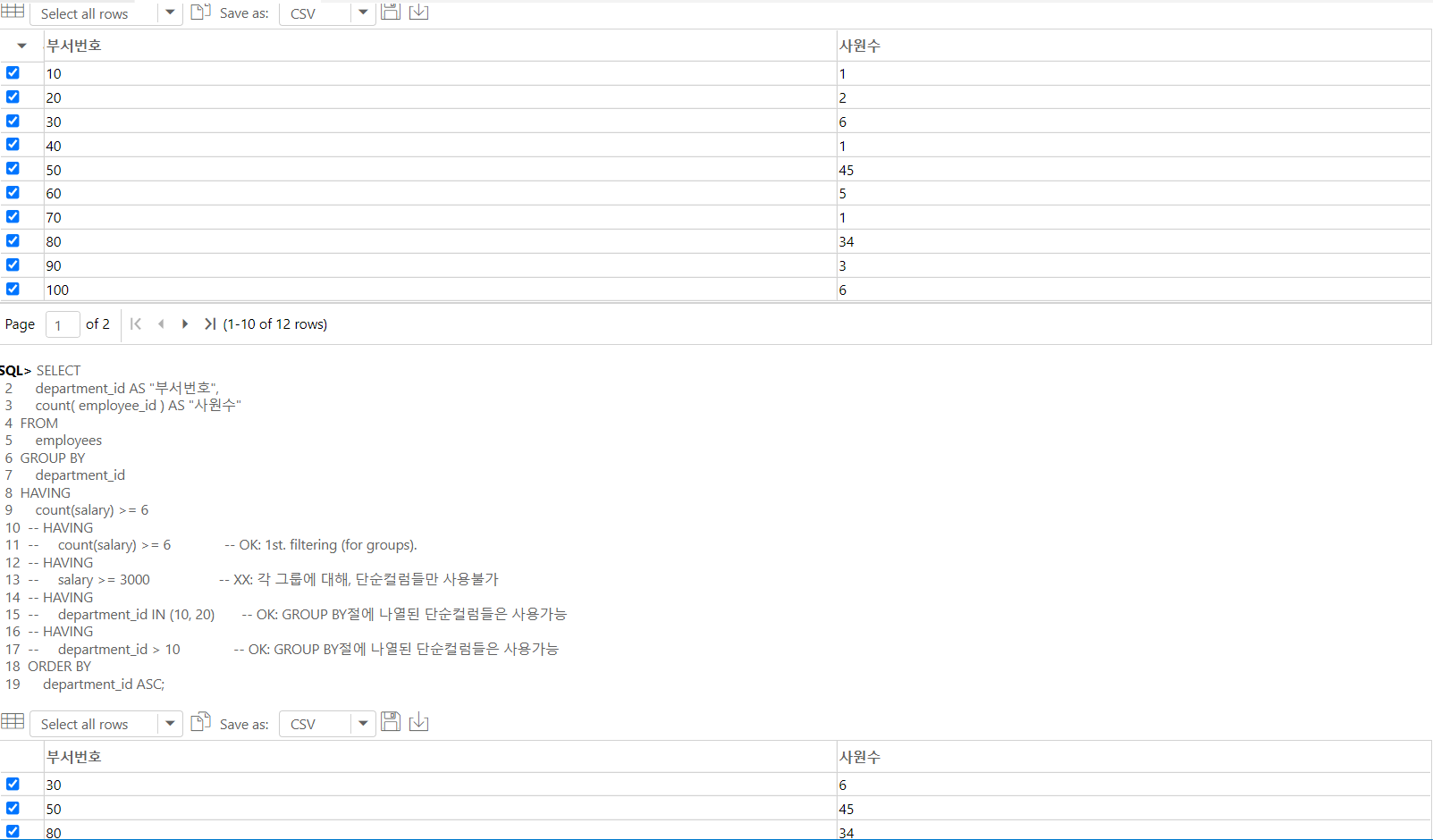 -- 이렇게, HAVING 절까지 실행되면, 테이블의 전체 행들이, 2번의
