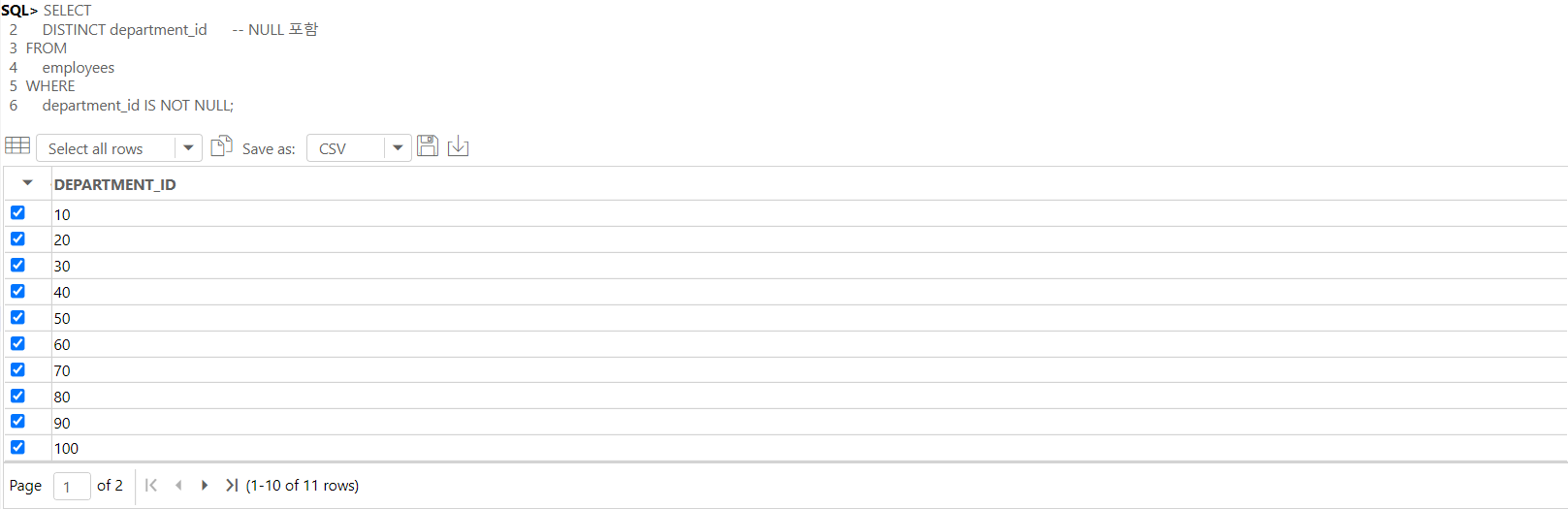 -- department_id는 NULL을 허용하기에 WHERE 조건문을 통해서 필터링을 진행하여 NULL값을 지웠다.