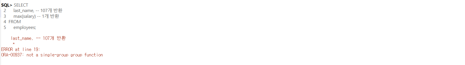 -- WHERE 절에는 그룹함수를 사용할 수 없다!!