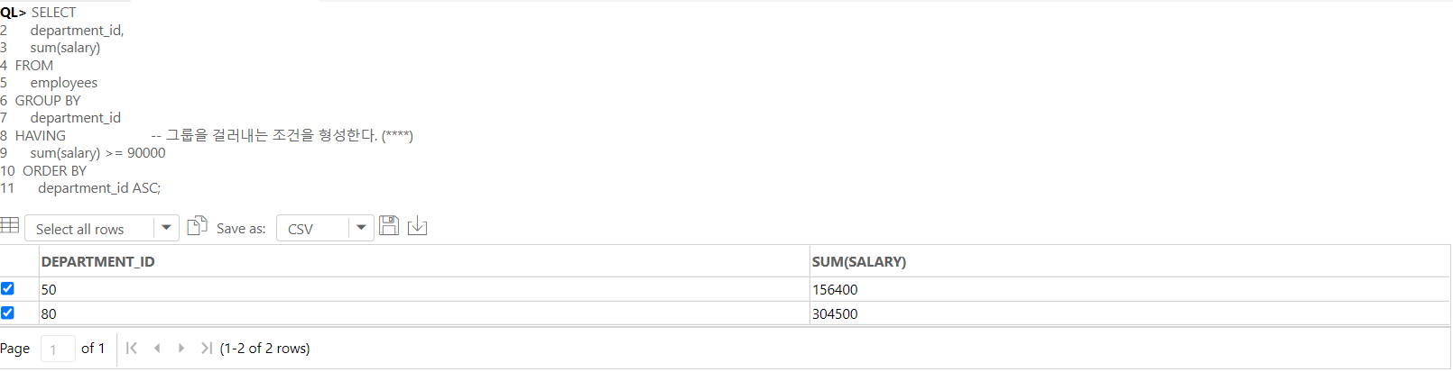 sum(salary) >= 90000 -- 2차 필터링