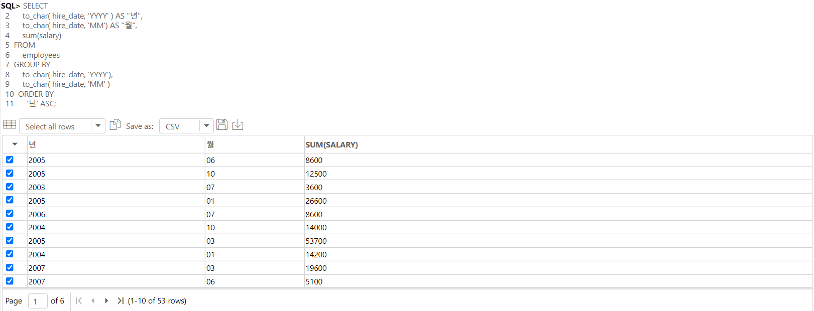-- 입사한 년과 월이 같은 동기를 그룹화하여, 월급을 총 합계를 구하여 출력한다.